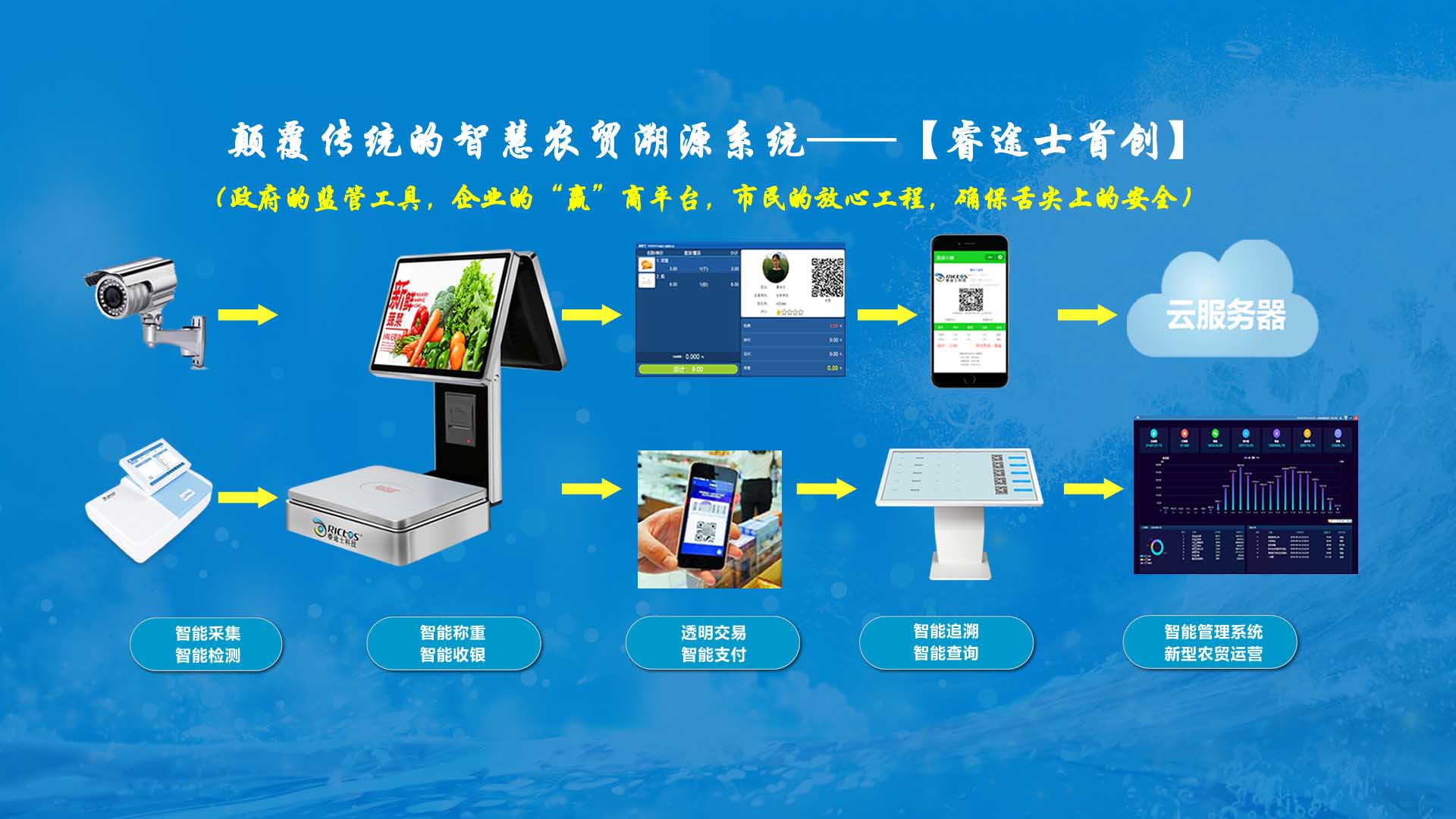 創(chuàng)新實(shí)現(xiàn)了【智慧農(nóng)貿(mào)溯源管理系統(tǒng)】與【智能稱重收銀】一體化解決方案,集市場(chǎng)管理、運(yùn)營(yíng)管理、溯源追溯、智能收銀大數(shù)據(jù)運(yùn)用于一體,硬件、軟件與管理系統(tǒng)完美結(jié)合。適用于農(nóng)批、農(nóng)貿(mào)市場(chǎng)蔬菜、生鮮、水果、水產(chǎn)、肉類、熟食等稱重和非稱重銷售;由于采用一體化設(shè)計(jì),解決了傳統(tǒng)農(nóng)貿(mào)市場(chǎng)無(wú)法實(shí)現(xiàn)的信息化、智能化、可追溯的管理問(wèn)題;使稱重、收銀、追溯、管理、更透明、公正、安全,讓顧客無(wú)后顧之憂,給管理工作帶來(lái)極大的便捷與高效,對(duì)國(guó)內(nèi)農(nóng)產(chǎn)品行業(yè)的發(fā)展、農(nóng)產(chǎn)品流通管理起到了典范作用。