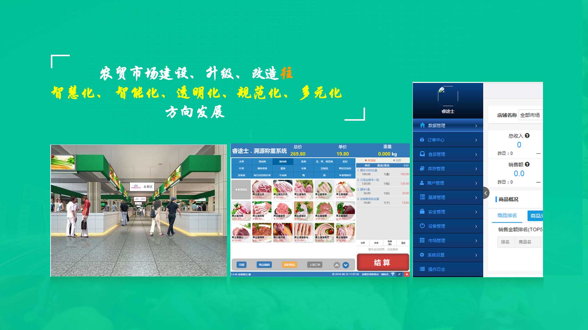 【睿途士首創(chuàng)】顛覆傳統(tǒng)的“智慧農(nóng)貿(mào)市場(chǎng)系統(tǒng)”,解決了傳統(tǒng)農(nóng)貿(mào)系統(tǒng)單一安卓掛屏,昂視不方便看、不直觀、無(wú)互動(dòng)性,傳輸信息不齊全、不穩(wěn)定的問(wèn)題,也解決了按鍵電子秤商品難找、商品代碼難記、按鍵操作不靈活、支付不智能,對(duì)收銀管理、銷售商品、菜名、菜價(jià)、打折、優(yōu)惠、會(huì)員、線上下單、采購(gòu)等無(wú)法實(shí)現(xiàn)實(shí)際菜品交易和追溯等問(wèn)題。